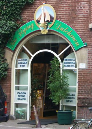 Right on one of the most INTERESTING corners in the Dam, on the Oude Hoog Straat, just two blocks from the Dam Square in the heart of the Red Light District. On the corner of the Oudezijdes Achterburgwal. You can’t miss it. Look for the Cannabis plants in the window.